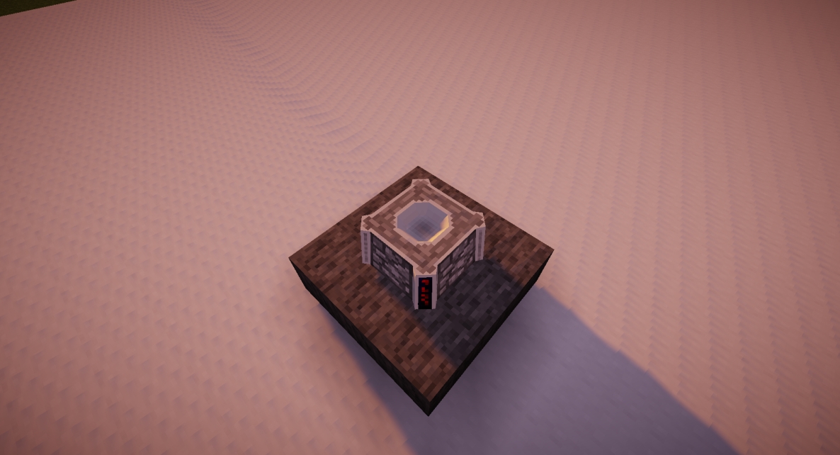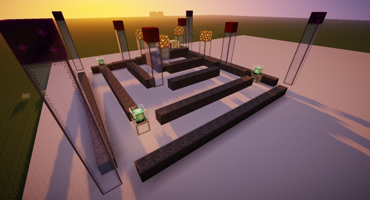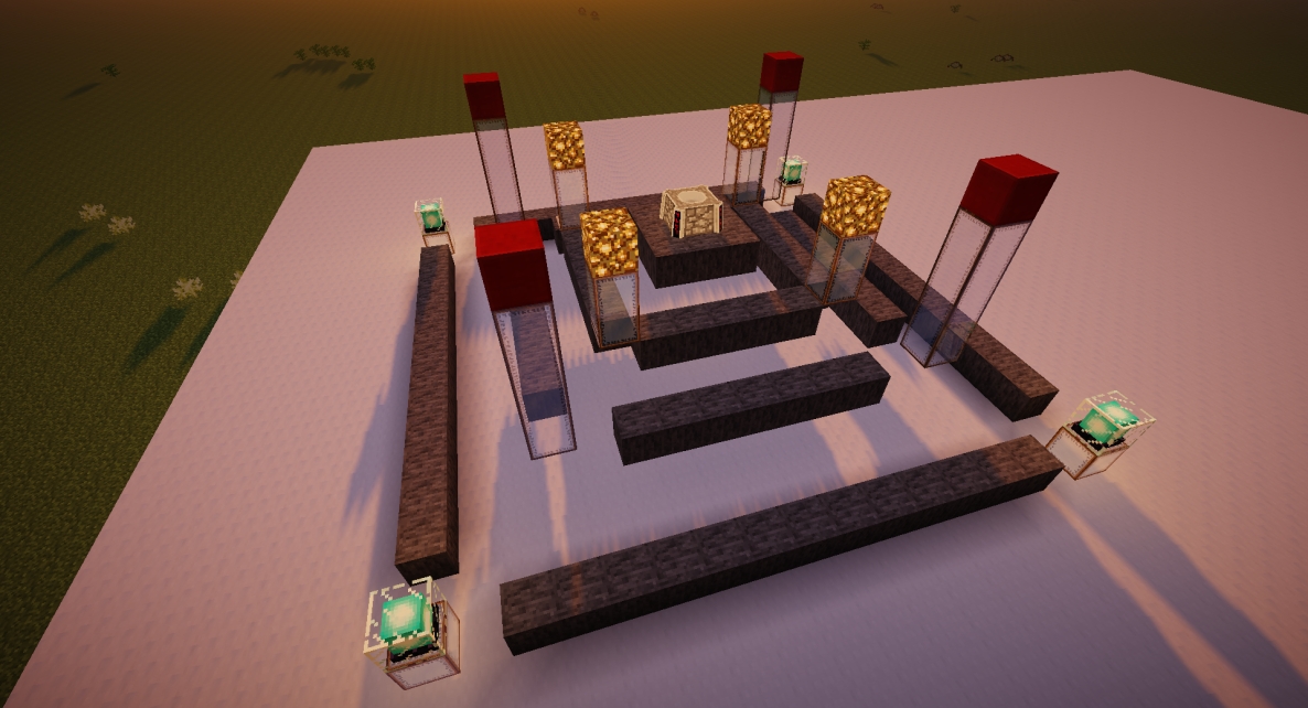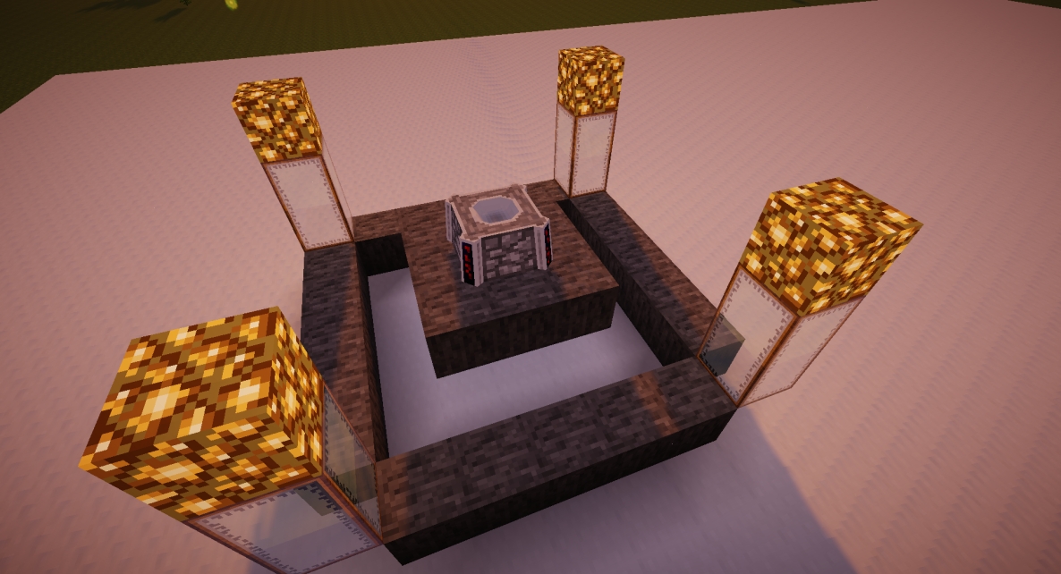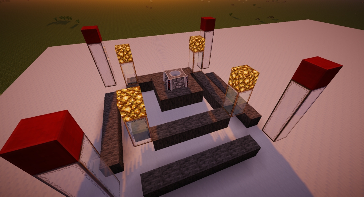 На каждом углу требуется установить по блоку кристального скопления, который должен быть на 1 уровень выше кровавого кирпича.
