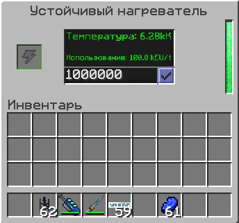 Внутрь устойчивого нагревателя пишем любое число и нажимаем галочку (Чем больше число - тем больше генерация пара, максимум - 1000000).