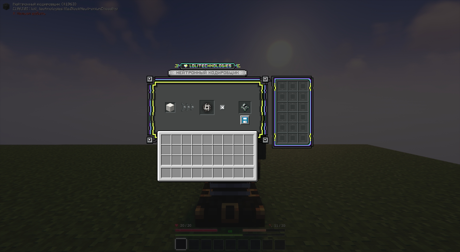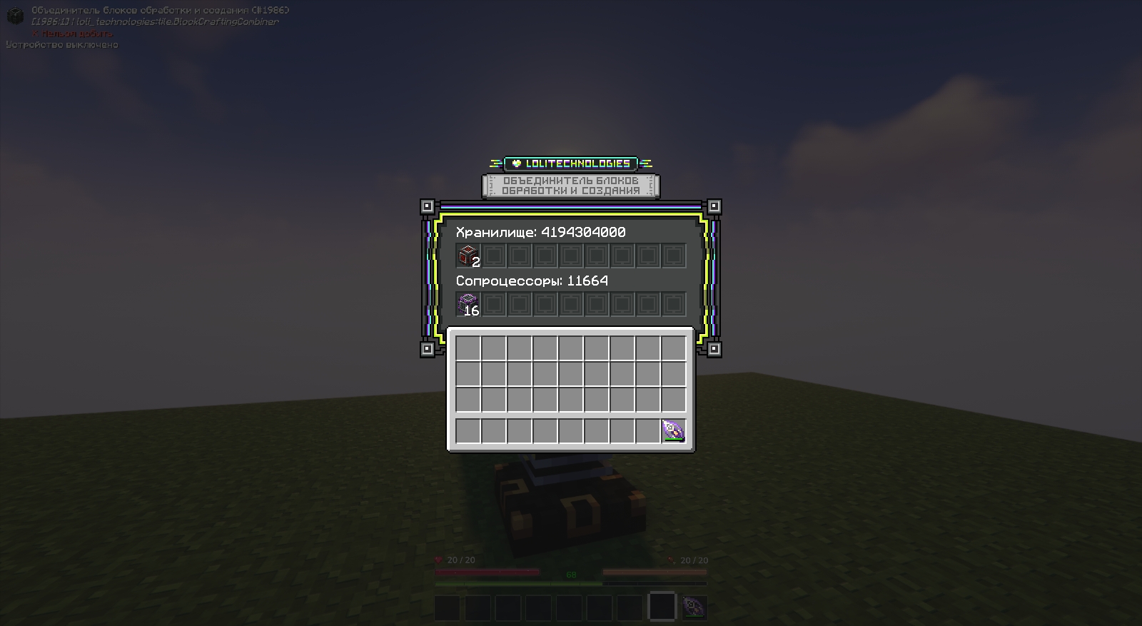 Объединяет блоки обработки и создания в один блок. Имеет 9 слотов под блоки обработки и 9 слотов под блоки создания и возможность заполнить их по 64 штуки в каждом. При работе объединителя, если нажать ПКМ - открывается окно использования ЦП, а при нажатии Shift + ПКМ - открывается интерфейс хранения