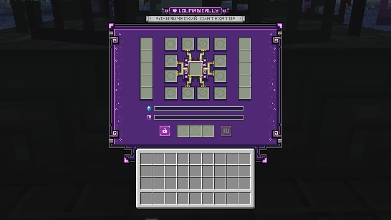 В интерфейсе Алхимического синтезатора слоты по центру - для ингредиентов крафта, справа и слева - для аспектов, нижние слоты - для улучшений (Магическое улучшение стак, Улучшение Асгард). Справа от слотов улучшений кнопка «Запомнить крафт», а слева - «Автоматическая сортировка».