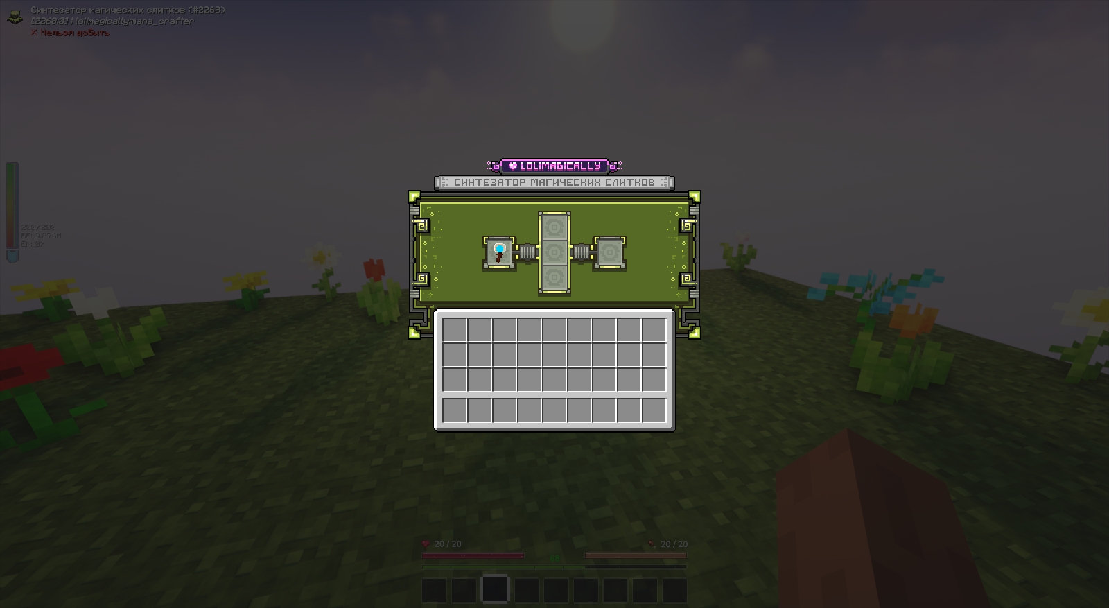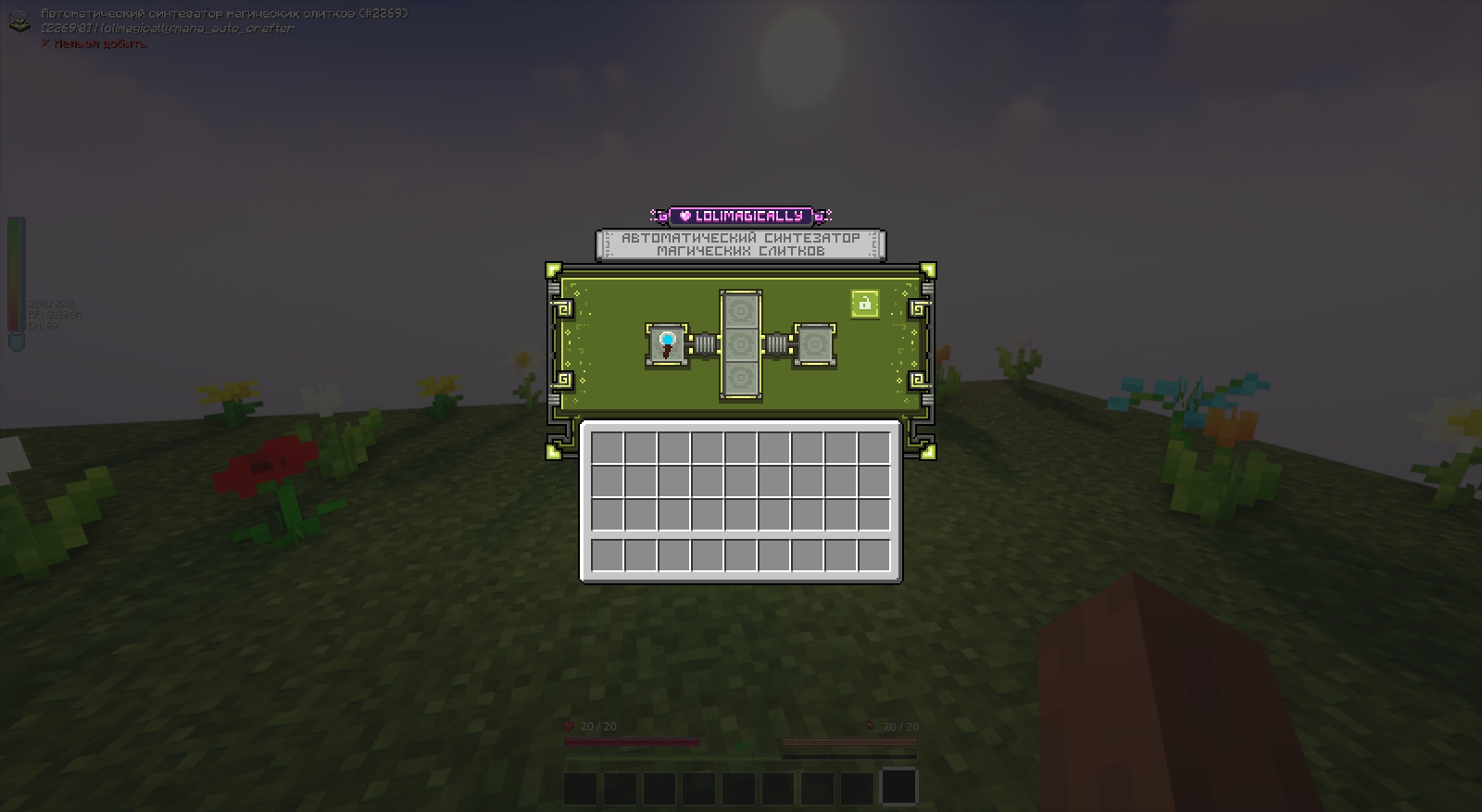Аналог обычного синтезатора магических слитков, однако эта версия может работать с МЭ интерфейсами, трубами, воронками и так далее. Чтобы использовать механизм, выложите нужный крафт и нажмите кнопку для запоминания крафта.