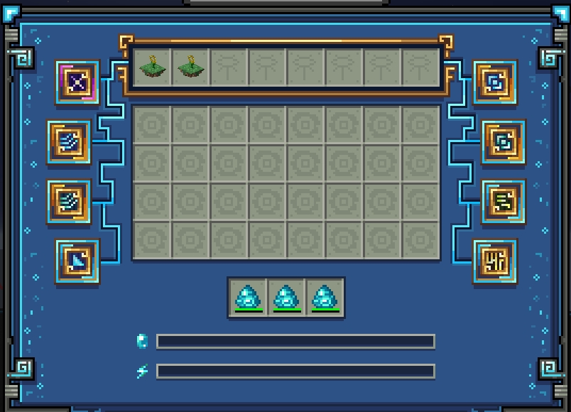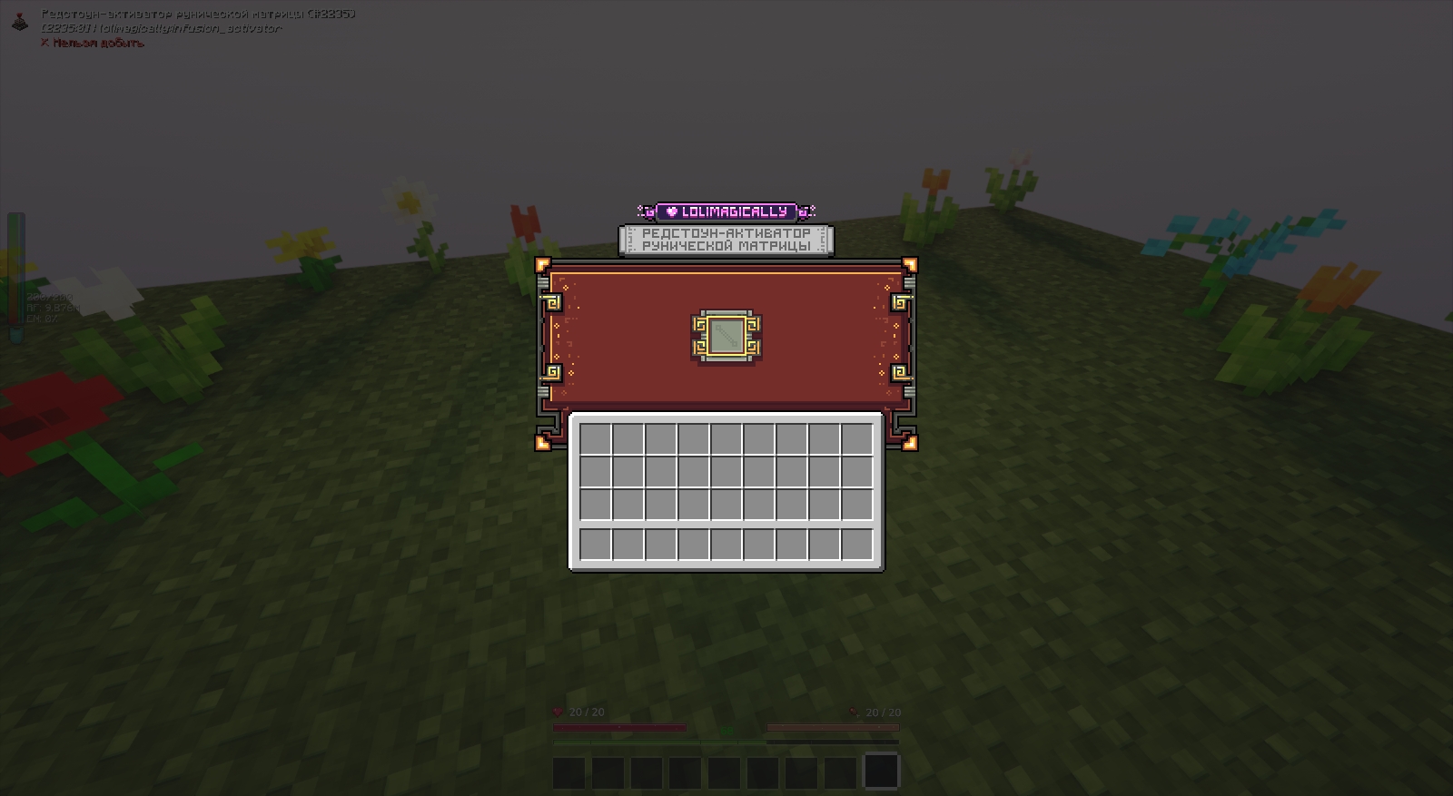 Улучшения кладутся в крайние левые и правые слоты. Нижние слоты нужны для Скоплений кристаллизованной маны. Верхние - для генерирующих цветов. Центральные слоты - топливо для работы цветов, например, для Гурмарилиса - любая еда.