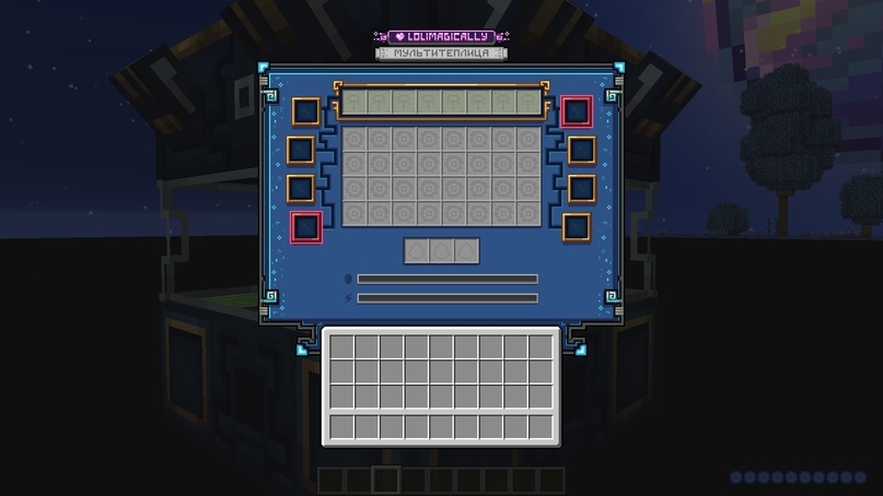 Чтобы построить мультитеплицу - необходимо использовать следующие блоки: Ядро мультитеплицы, Основу мультитеплицы, Темные манакирпичи и Манастекло(из мода LoliMagically). Чтобы собрать Мультитеплицу - кликните ПКМ по конструкции Посохом леса из Botania.